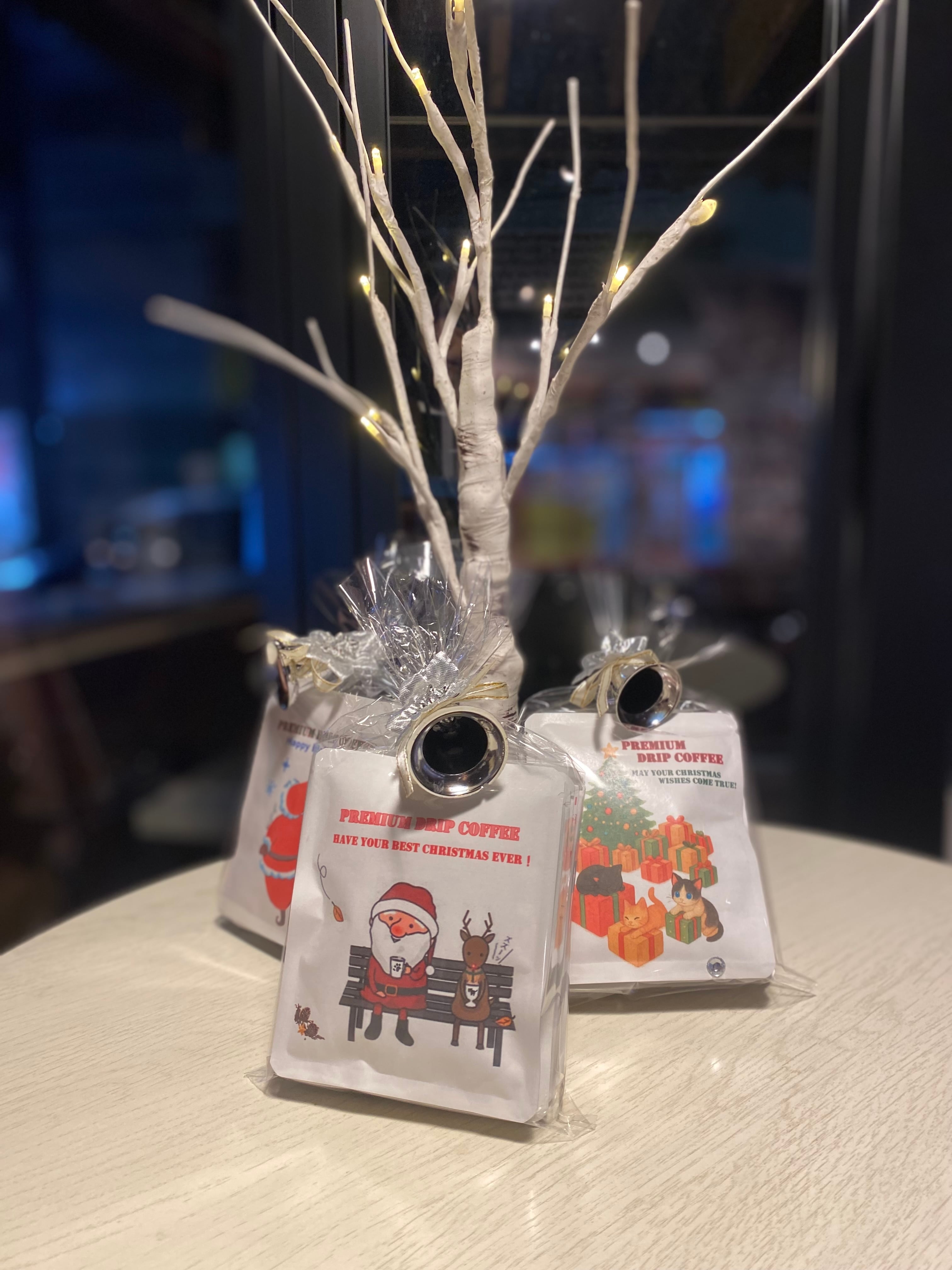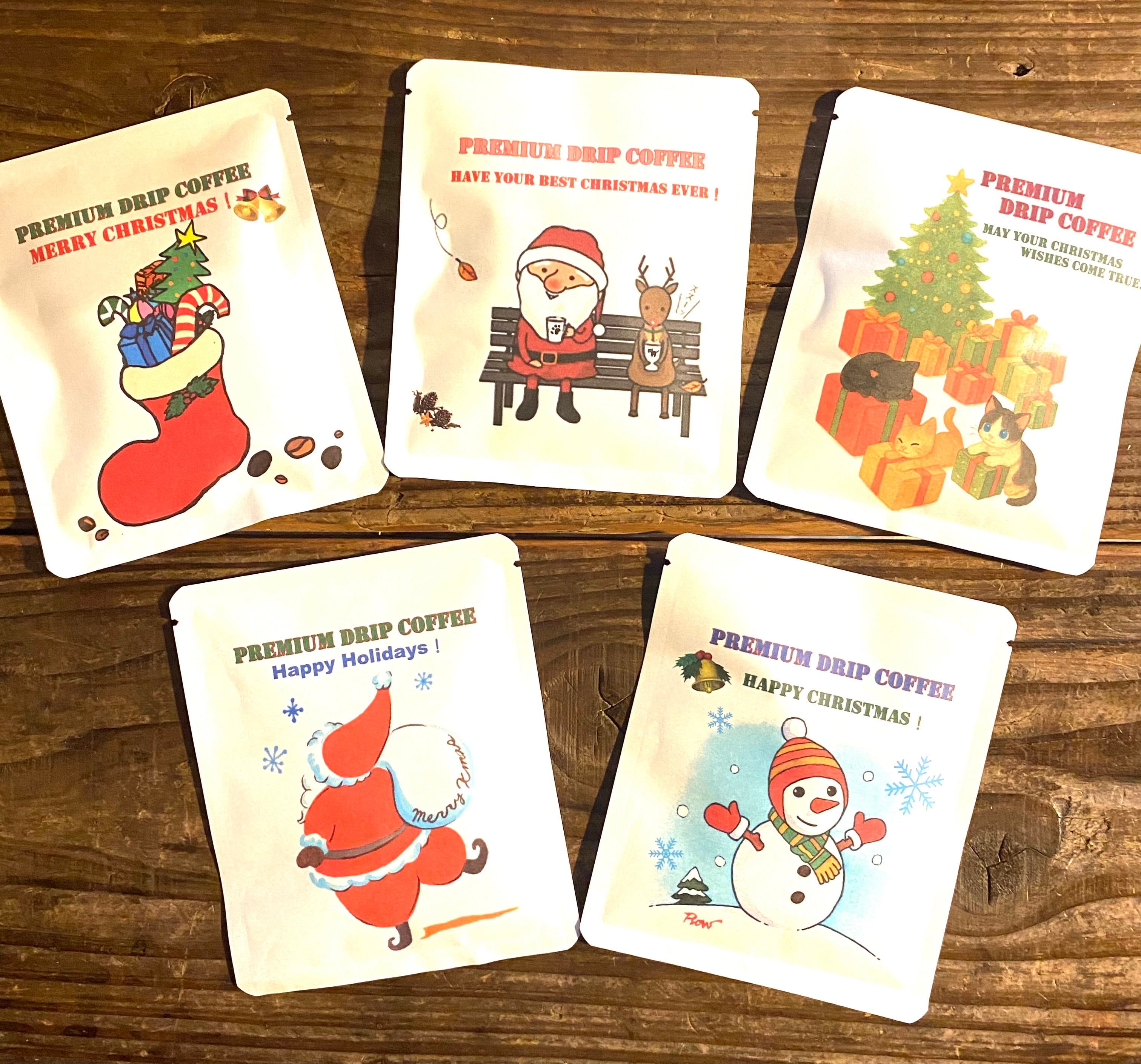 お楽しみいただけるクリスマスドリップバッグの5個セット2025です。5種類の味わい深いコーヒーと、可愛らしい絵柄のセットになっています。